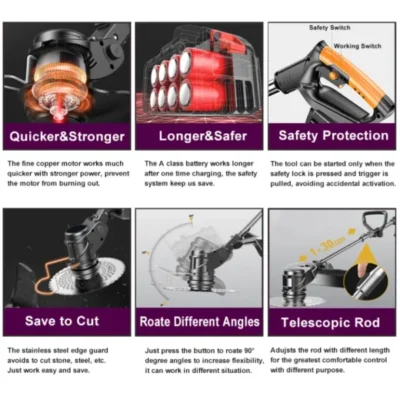 - Planet-conscious: it’s quieter than gas, instant starting, and best of all virtually zero maintenance, no pull cords, no mixing gas and oil, and no smelly gas fumes.